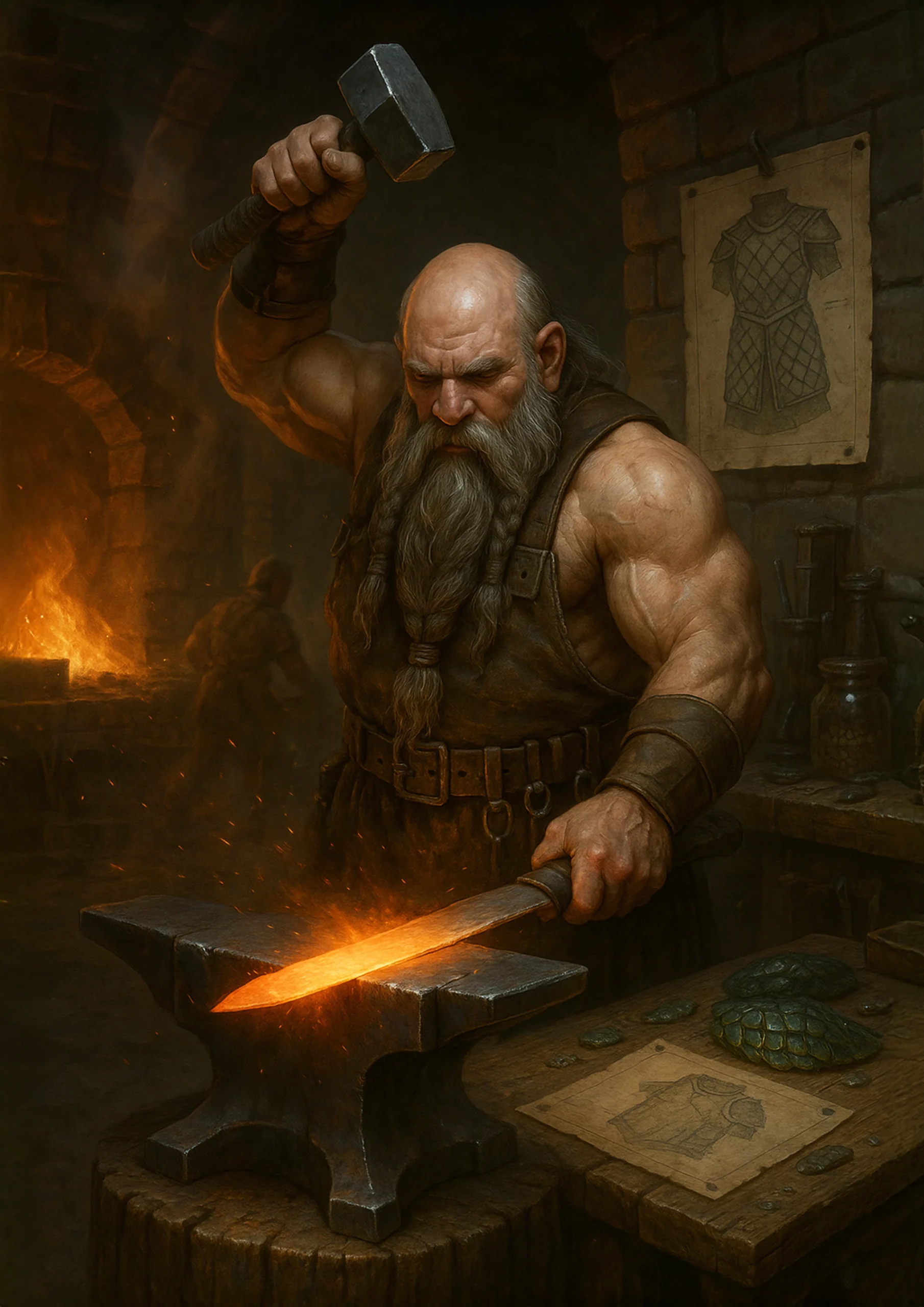 Tego samego wieczoru Felix udał się jeszcze do Buridana. W kuźni tlił się żar, a powietrze drżało od ciepła i stukotu młotów. Kapłan poprosił krasnoluda o wykucie dwóch symboli — jeden ku czci Selûne, drugi Hoara. Miały stanąć naprzeciw siebie w podziemiach, symbolizując równowagę między światłem a gniewem, łaską a sprawiedliwością.