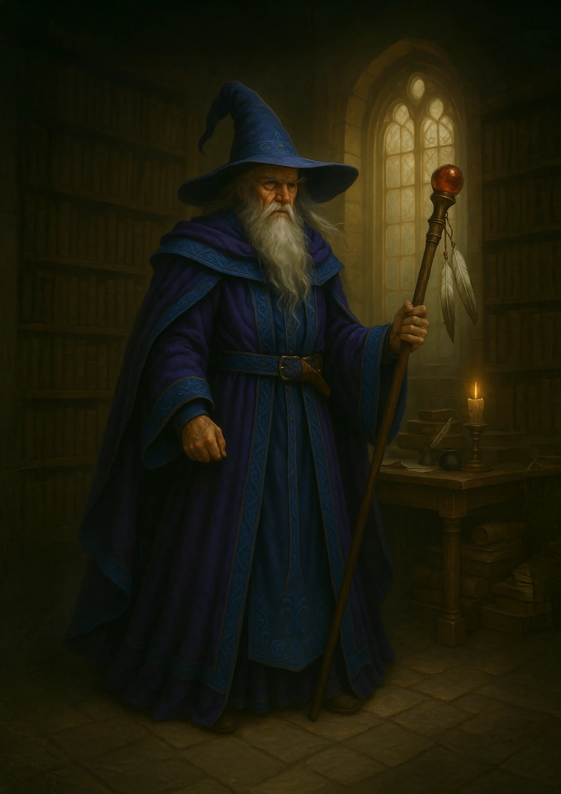 Przy jednym ze stołów siedział starzec o niezwykle dostojnym, a zarazem ekscentrycznym wyglądzie. Ubrany był w długie, falbaniaste szaty o barwach głębokiego fioletu i błękitu. Na głowie miał wielki, spiczasty kapelusz, a jego długa, siwa broda sięgała niemal do pasa. Kiedy usłyszał kroki Ambraxasa, odwrócił się z szerokim uśmiechem i uniósł rękę w geście powitania.