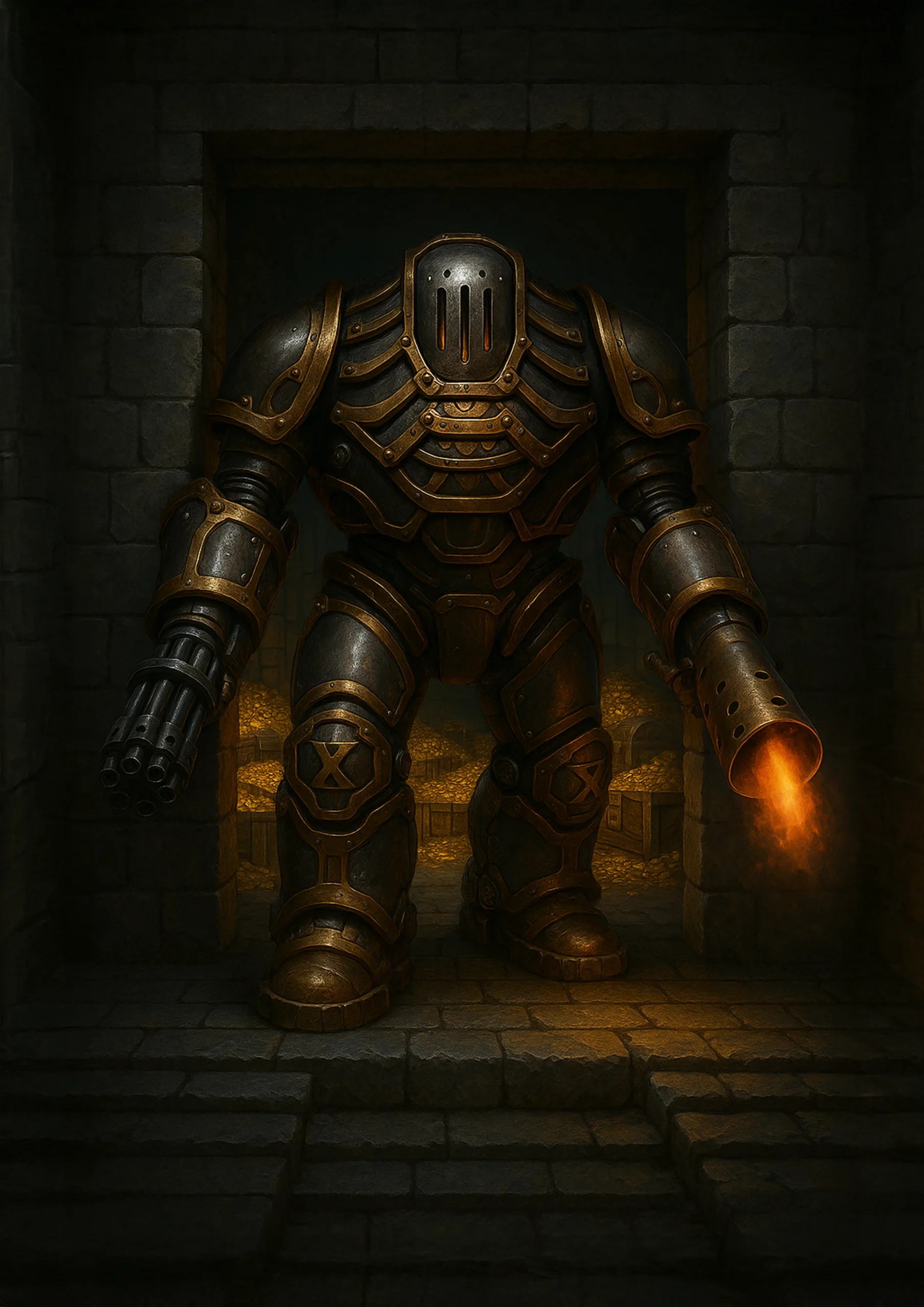 Za drzwiami czekała ogromna, ciemna komnata. I coś, co wypełniło wejście do niej niemal w całości. Przed Felixem stanął potężny krasnoludzki konstrukt — Orcbuster, dawno odnaleziony przez Ambraxasa, oddelegowany do pełnienia funkcji strażnika skarbów Bractwa Złotej Włóczni. Jego masywna sylwetka emanowała potężną, surową magią. Prawa ręka maszyny przypominała działo obrotowe, lewa — miotacz ognia, a jego głowa błyszczała runicznymi symbolami.
