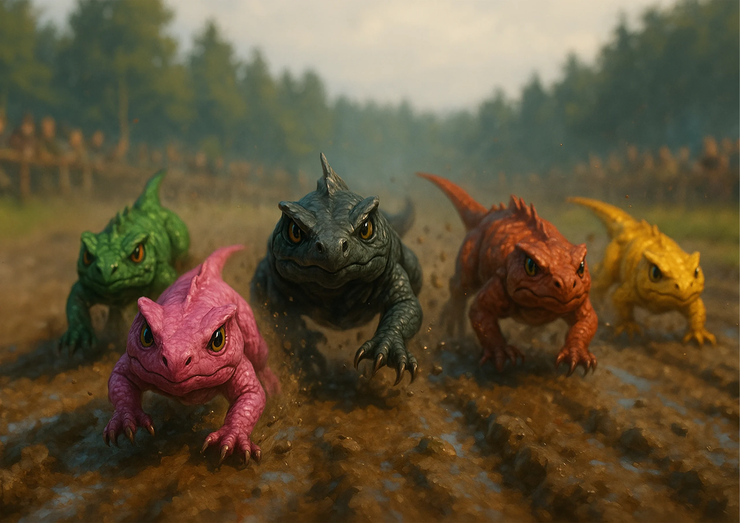 Na linii startu ustawiono pięć jaszczurów — bestie różnej wielkości, barw i temperamentów. Ich łuski błyszczały w słońcu, oczy pełne były dzikiego instynktu i nieokiełznanego chaosu.
