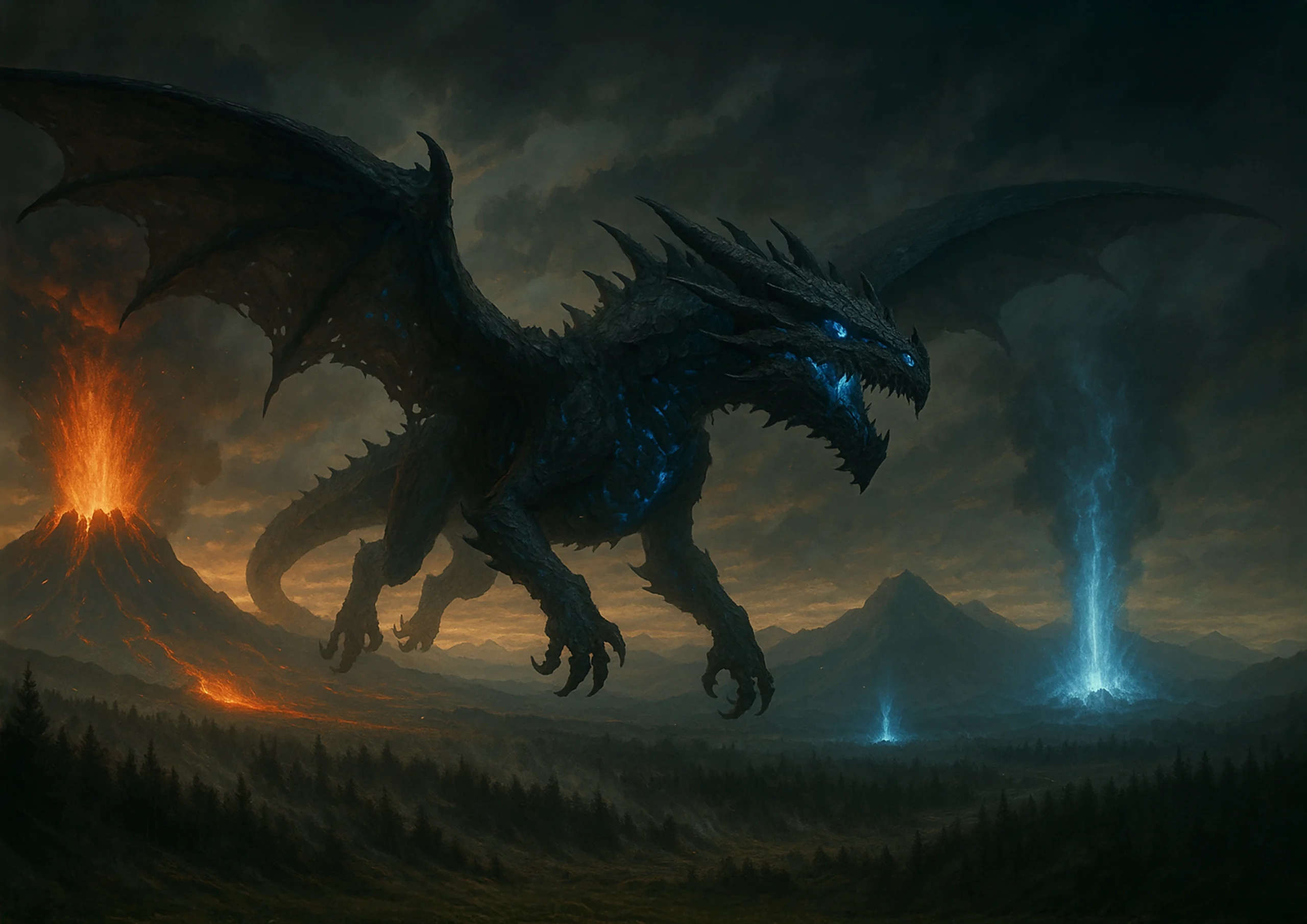 Z północy, ponad górami, z czarnych chmur dymu i popiołu wyłonił się kolosalny kształt. Na tle płonącego nieba uniosła się sylwetka smoka — olbrzymiego, potężnego, o skrzydłach rozpostartych jak góry. Z jego oczodołów bił błękitny, nekrotyczny ogień, a jego ciało było niczym ruina — martwe, a jednak żywe, ożywione gniewem i magią.