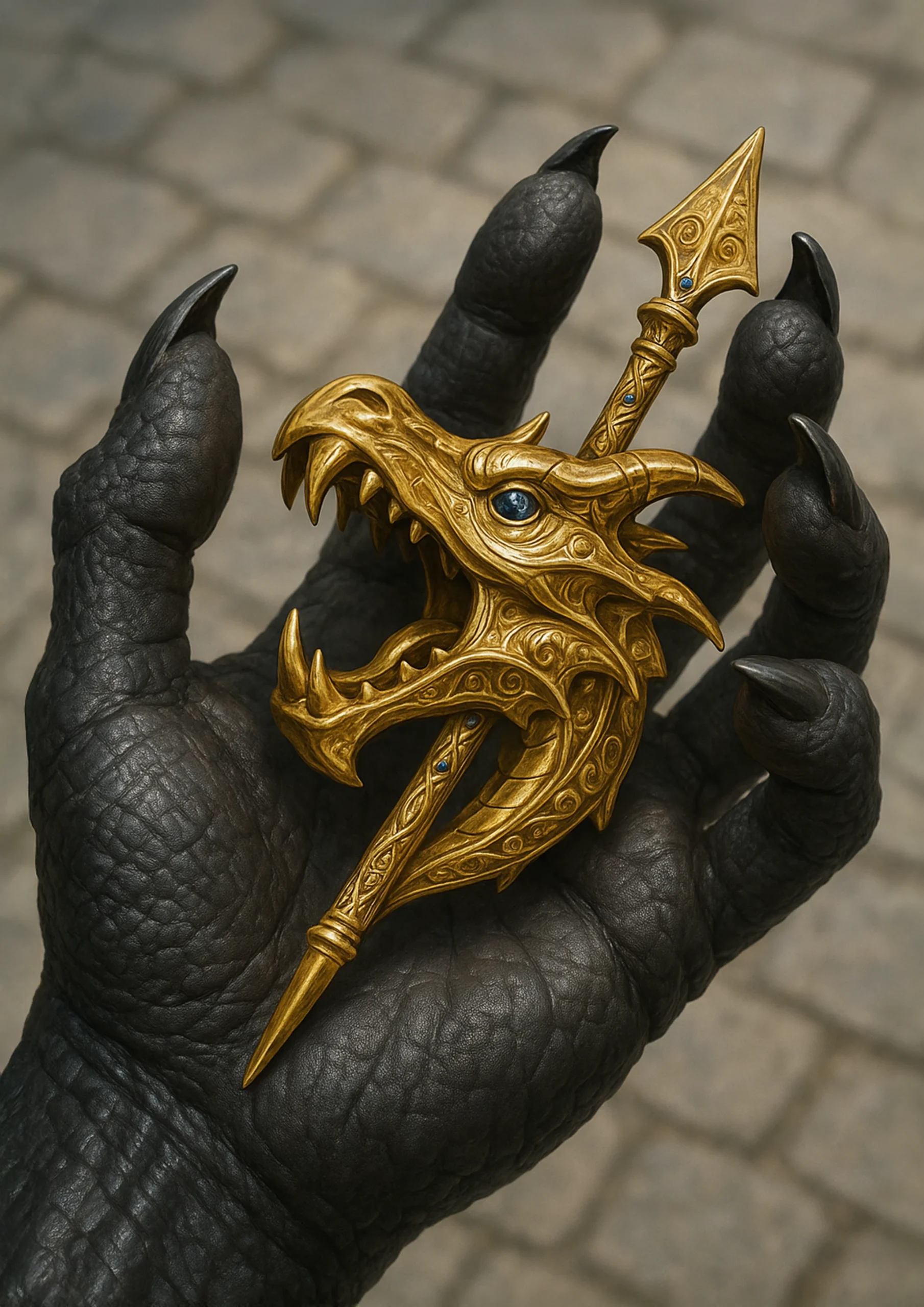 Zanim jednak ruszyli, Ambraxas poprosił kompanów, by poczekali na niego przy starym grobowcu. Sam udał się do Buridana, by odebrać zlecenie sprzed ich wyprawy. Krasnolud, jak zwykle pokryty kurzem i pyłem, wyciągnął z kufra skrzynię i z dumą zaprezentował paladynowi dwadzieścia dwie przypinki — wykonane ze złota, w kształcie smoczej głowy przebitej włócznią. Symbol Bractwa Złotej Włóczni — znak odwagi, honoru i przynależności. Ambraxas odebrał je z satysfakcją, wiedząc, że staną się rozpoznawalnym znakiem ich bractwa w całym regionie.