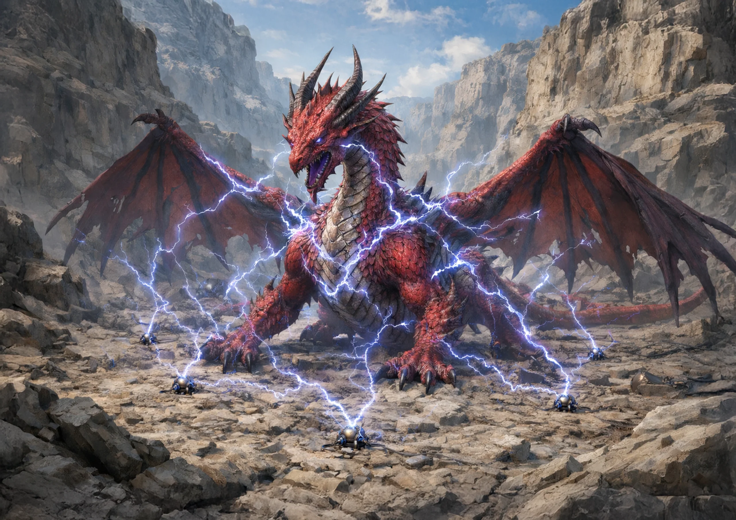 Dwa młodsze smoki znieruchomiały w powietrzu, sparaliżowane strachem. Smoczyca zanurkowała gwałtownie w kierunku drakona i wylądowała dokładnie w miejscu zasadzki. W tej samej chwili Ambraxas wbił w ziemię ostatnią z metalowych kul Borina. Pioruny wystrzeliły z urządzeń, połączyły się ze sobą i oplotły smoczycę, przyciskając ją do ziemi.