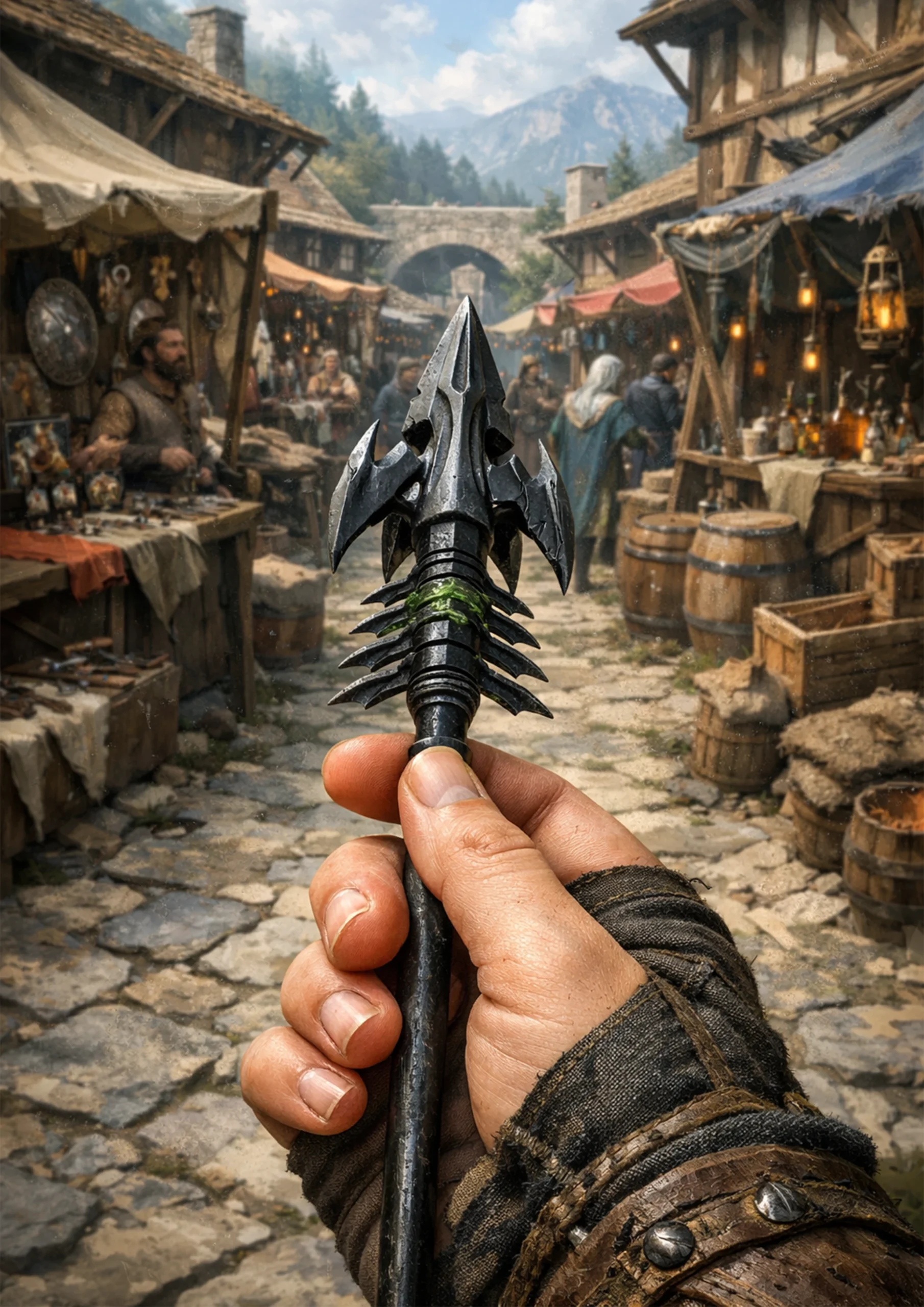 Sprzedawca, nie wierząc, również dotknął zatrutego grotu. Chwilę później z jego ust popłynęła piana, a on sam osunął się bezwładnie na ziemię. Paladyn zareagował natychmiast, klękając przy nim i przywracając go do życia swymi boskimi mocami.
