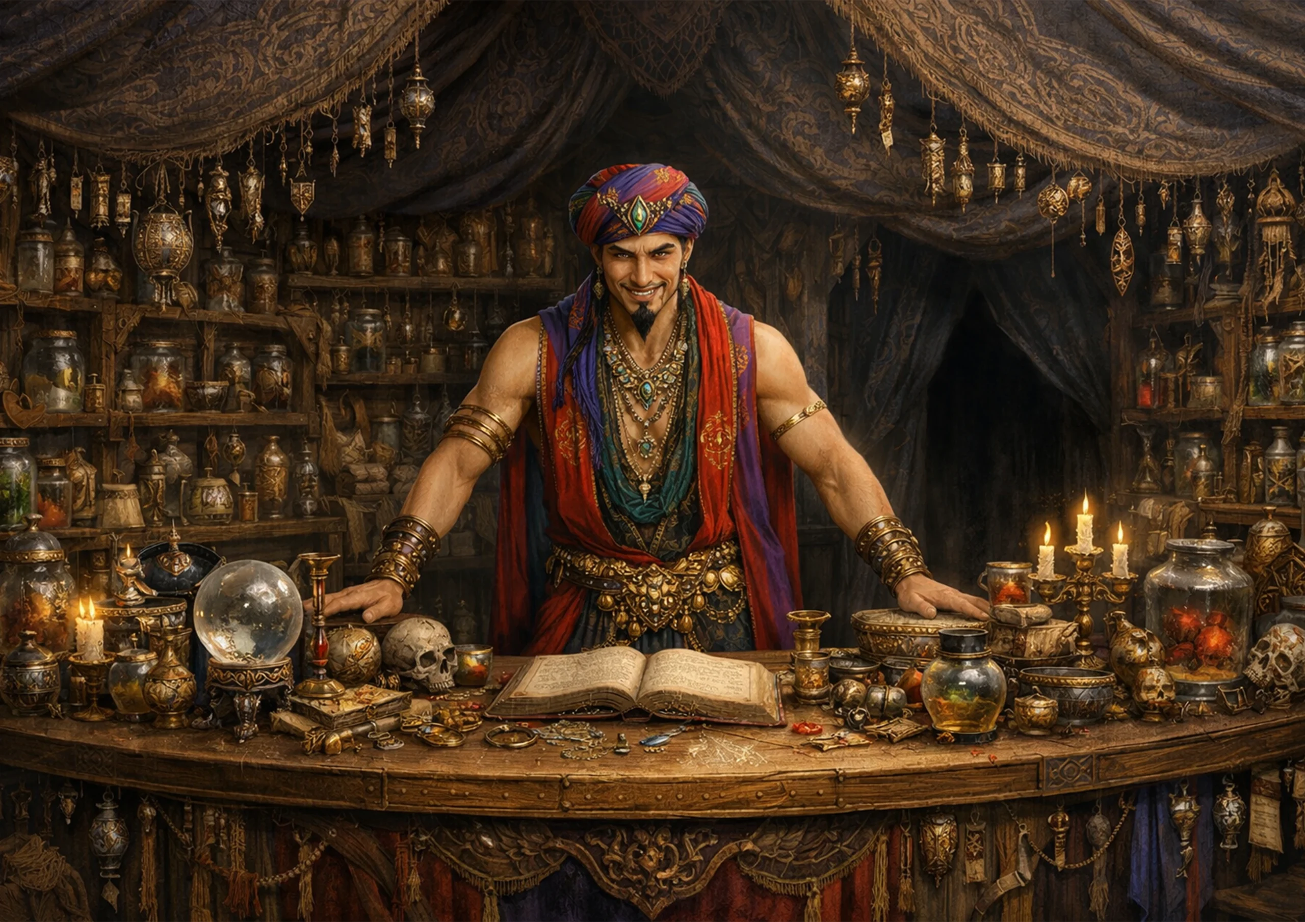 Wnętrze namiotu było wypełnione bibelotami, słoikami pełnymi rozmaitych ingrediencji, przeróżnymi artefaktami i wisiorkami. Pośrodku stał okrągły kontuar, a za nim znajdowała się czwórka dzieci, które jednocześnie rozpisywały różne księgi i notatniki. Ambraxas natychmiast wyczuł diabelską moc emanującą z tego miejsca, choć wiedział, że nie była to obecność Varikasa.