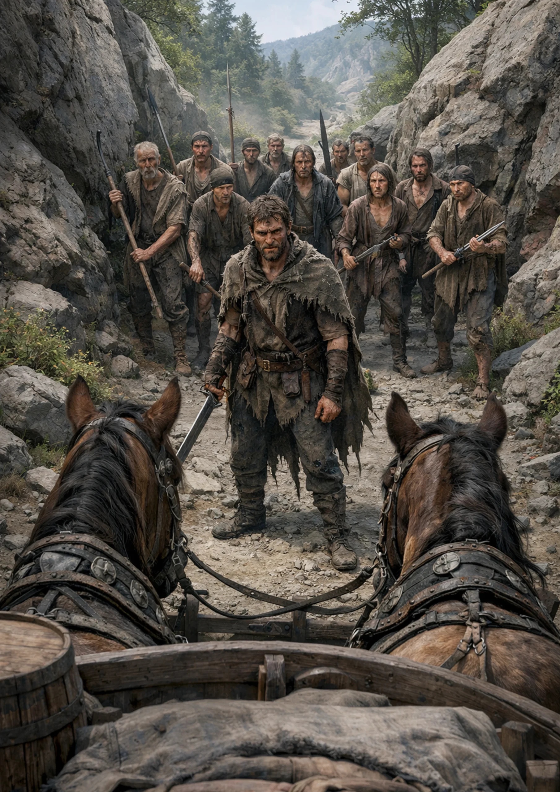 Kilka godzin później, gdy dzień chylił się już ku końcowi, a światło zaczęło przybierać ciepłe, przygaszone barwy, droga zwęziła się pomiędzy dwoma ogromnymi głazami. Wtedy z krzaków wyskoczyła nagle duża grupa mężczyzn. Uzbrojeni byli w łuki i topory, mieli na sobie poszarpane płaszcze. Ich twarze wyglądały na zmęczone, oczy zaś pełne desperacji. Było ich wielu i na pierwszy rzut oka widać było, że nie są zawodowcami.