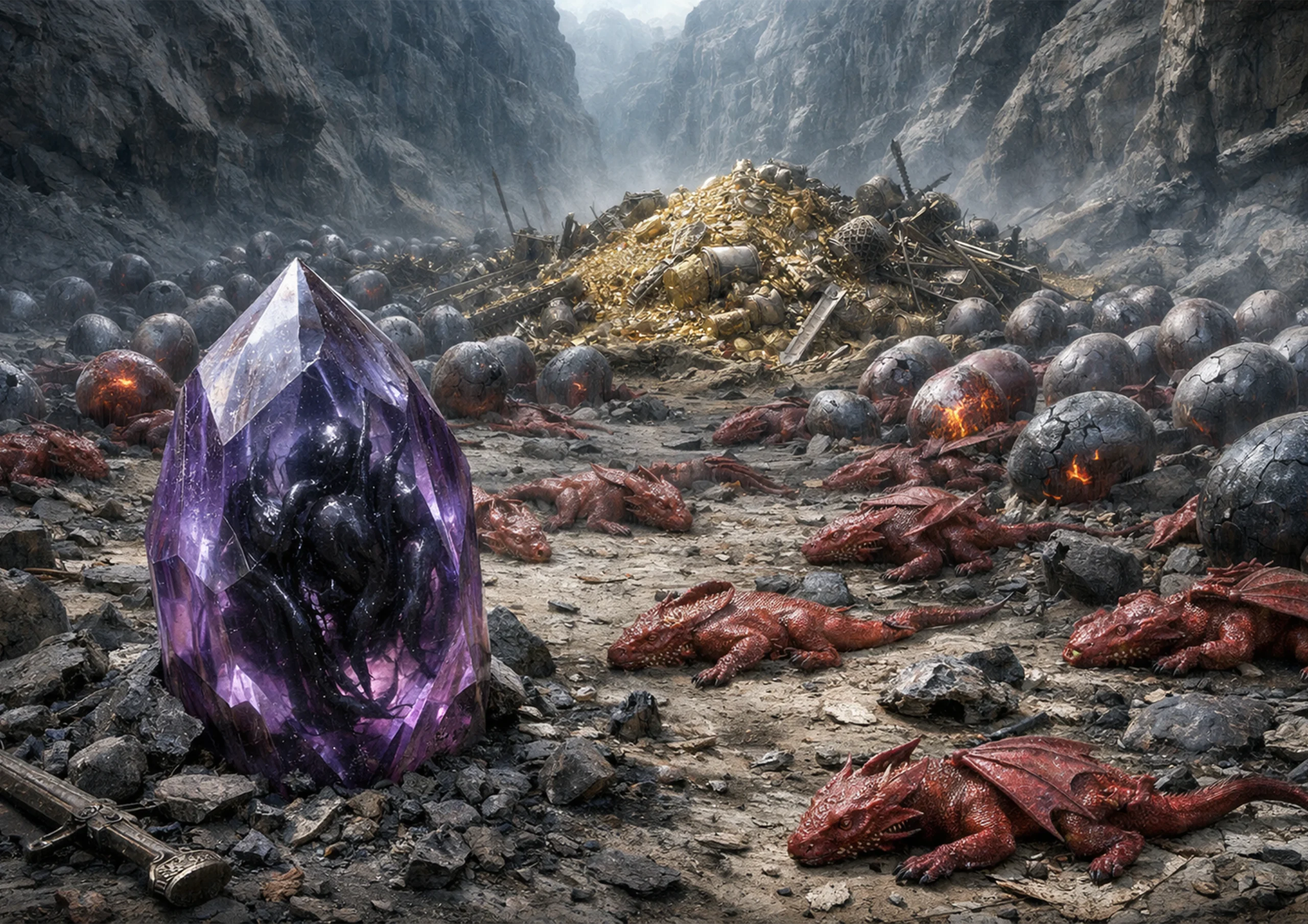Dotarł w końcu do niewielkiej doliny ukrytej w wąwozie. Ziemia była tam usłana czerwonymi, pulsującymi smoczymi jajami, jakby wewnątrz nich tlił się żywy ogień. Ich powierzchnia delikatnie drgała, a ciepło było wyczuwalne nawet z odległości. Niedaleko legowiska spał kolejny młody smok, a wokół jaj krążyły smocze pisklaki, skrzecząc cicho i trzepocząc skrzydłami.