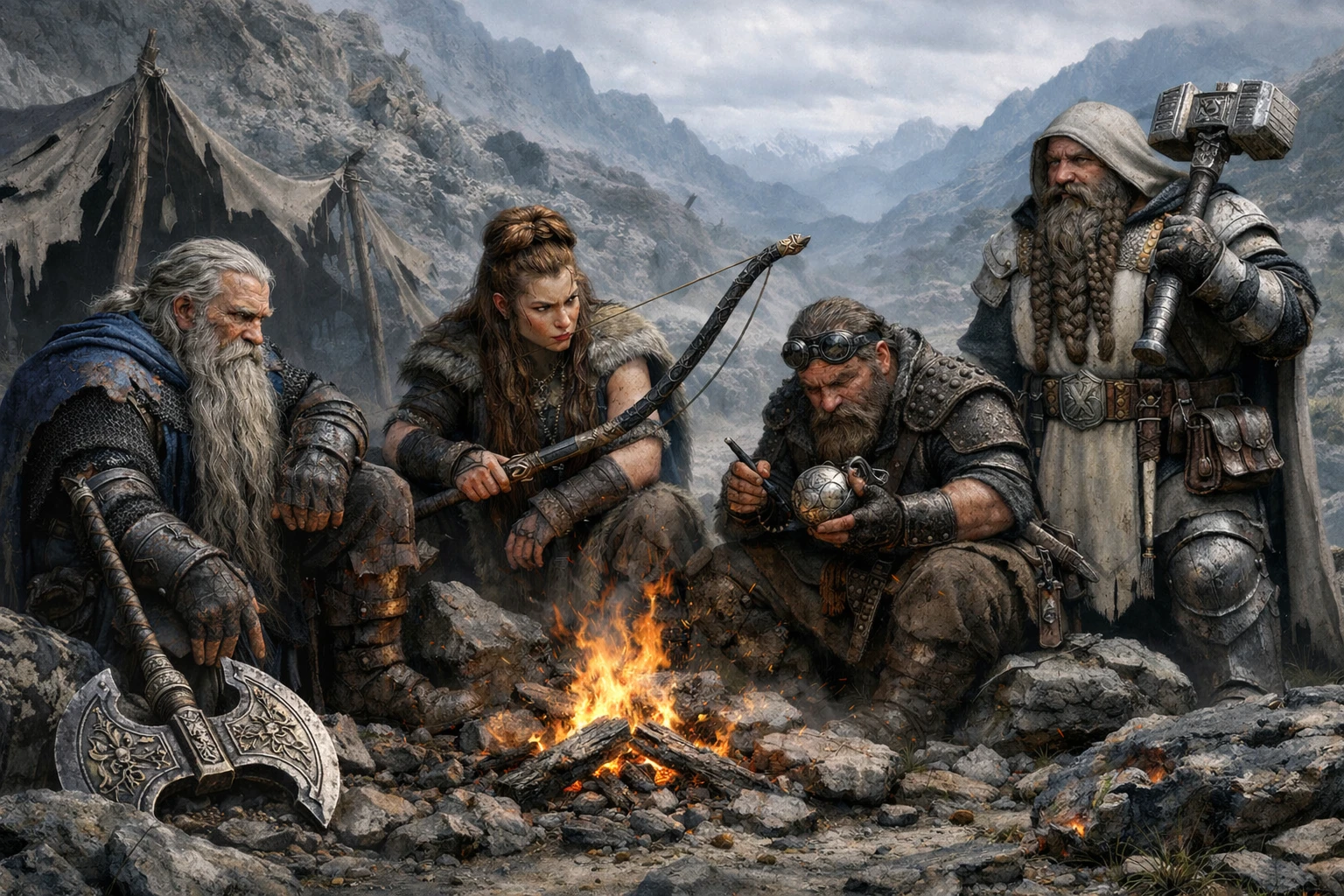 Wieczorem natknęli się na cztery krasnoludy siedzące przy ognisku. Ich twarze były wyraźnie zmęczone, lecz broń wciąż mieli pod ręką. Namioty były poszarpane, a na okolicznych kamieniach widniały ślady kwasu i ognia, co jasno sugerowało, że dzień mieli wyjątkowo ciężki. Krasnoludzki dowódca wstał i zmierzył bohaterów surowym spojrzeniem. Był starszym krasnoludem, z wapniejącą brodą i spalonymi rękawami.
