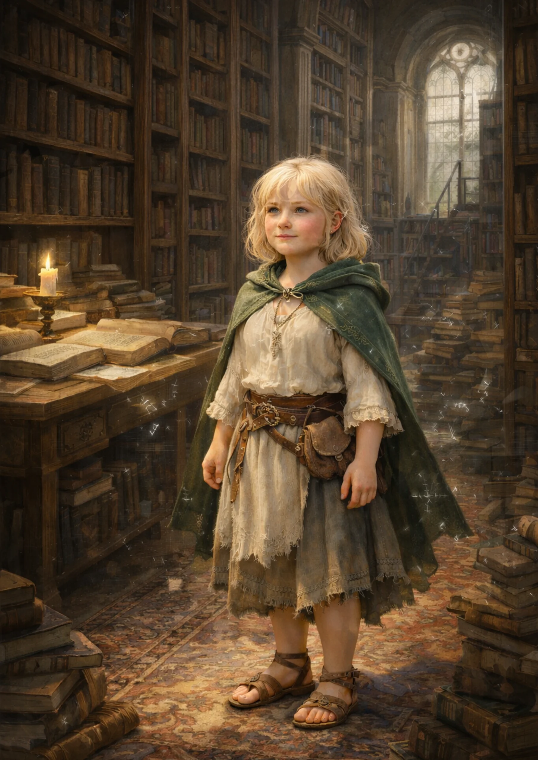 Poprowadziła ich jeszcze wyżej, schodami na kolejne piętro, do jednego z większych pokoi. Drzwi otworzyły się powoli. W środku siedziała Pellie, na bogato zdobionym łożu. Młoda hobbitka była ubrana w zwyczajne odzienie. Spojrzała na Hildę — przez krótką chwilę wydawało się, jakby jej nie rozpoznawała. Nagle jej twarz rozjaśniła się, a ona zerwała się z miejsca i rzuciła siostrze na szyję.