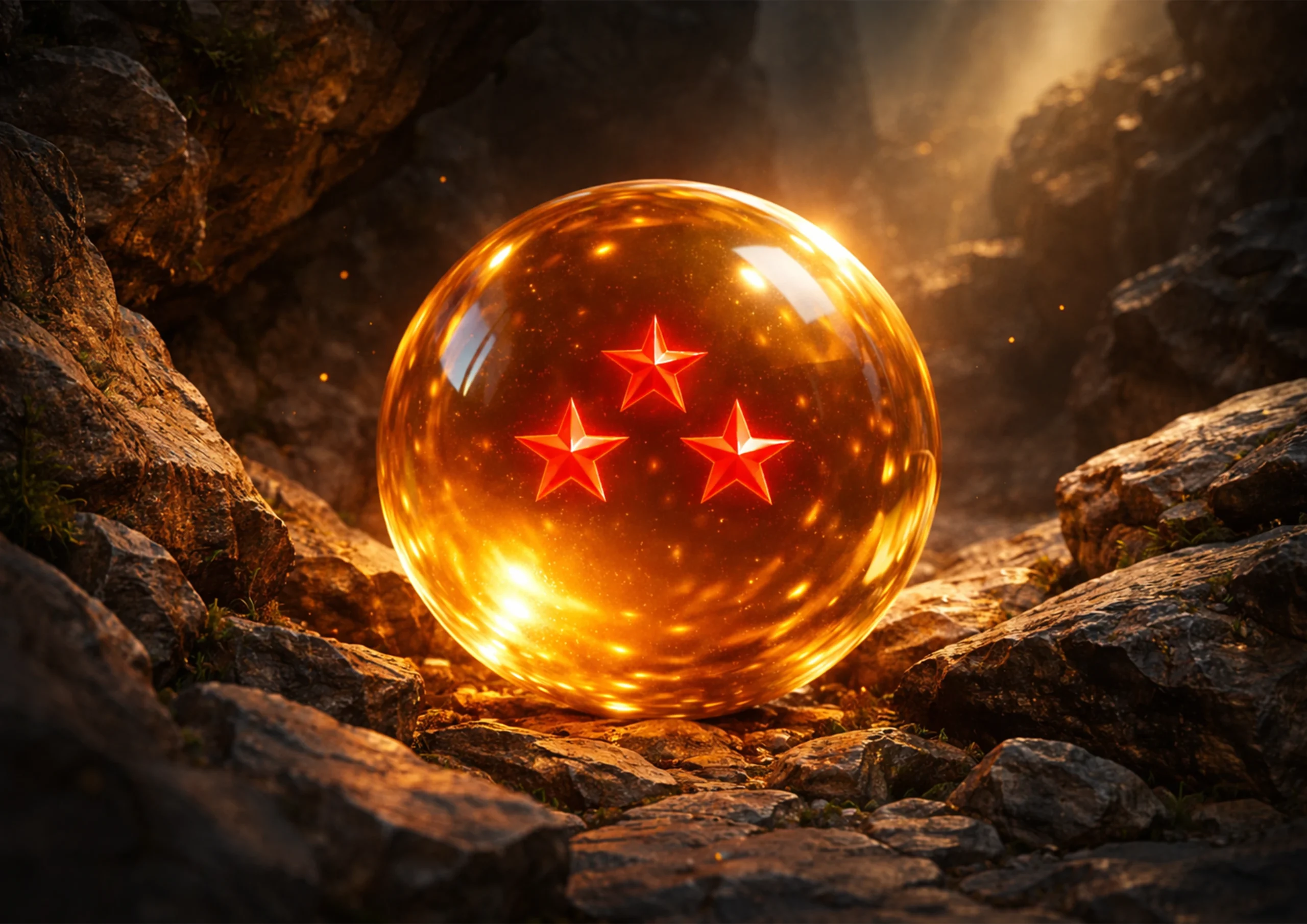 Hilda stała w centrum leża, uważnie przeszukując teren bystrym wzrokiem. W pewnym momencie dostrzegła błysk światła pomiędzy głazami. Z daleka wyglądało to jak porzucona biżuteria, lecz gdy podeszła bliżej, zrozumiała, że ma przed sobą coś zupełnie innego. Była to bursztynowa kula — idealnie gładka i przejrzysta, jakby wykuta z czystego światła. W jej wnętrzu unosiły się trzy czerwone gwiazdki, zawieszone nieruchomo w samym centrum. Kula delikatnie połyskiwała, odbijając światło w miękkich refleksach i sprawiając wrażenie artefaktu o ogromnej mocy.