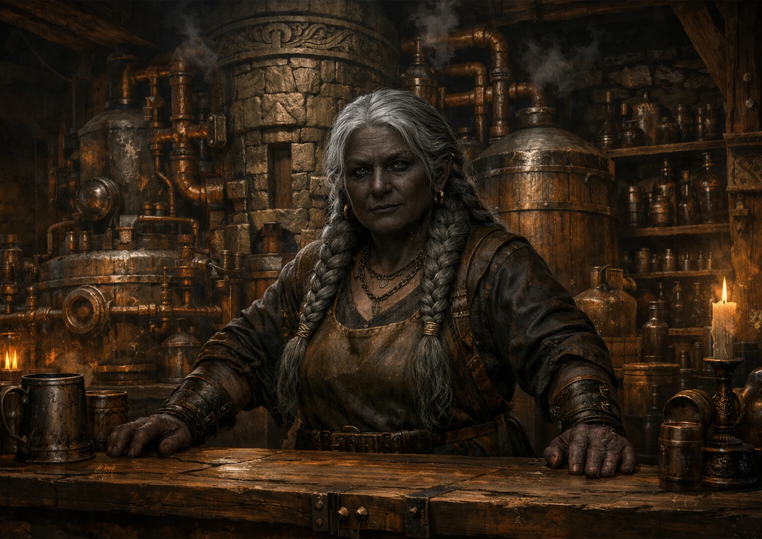 Za ladą stała karczmarka. Jej twarz była surowa, zmęczona i pozbawiona nadmiaru emocji, lecz w jej ruchach nie było nerwowości. Mimo ascetycznego wyglądu wnętrze sprawiało wrażenie przytulnego – jak schronienie, które trwało tu od dawna i zamierzało trwać nadal.