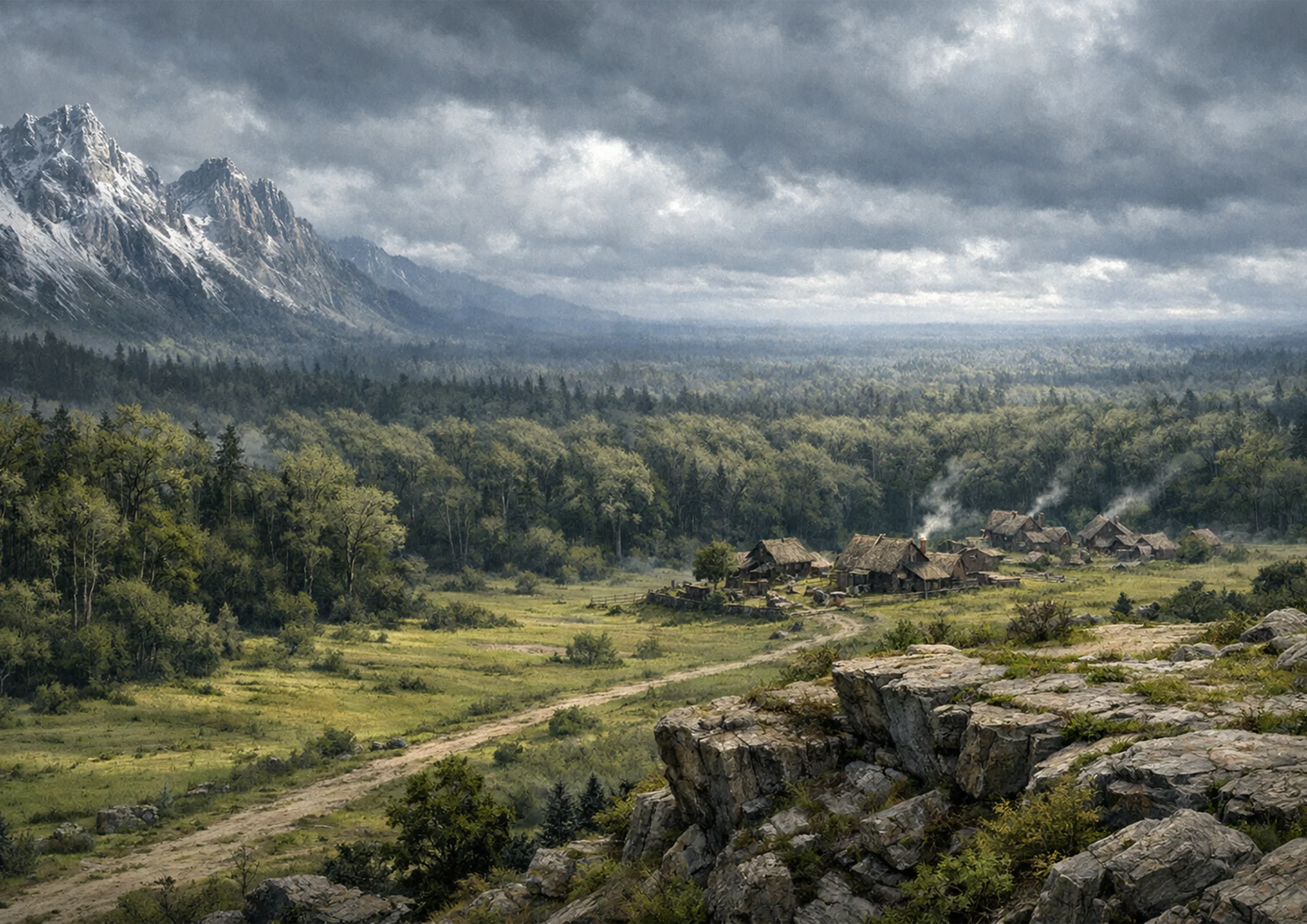 Dojście do wioski zajęło im niemal cały dzień. Słońce chyliło się już ku zachodowi, barwiąc niebo na przygaszony pomarańcz i purpurę, gdy w końcu dotarli na skraj osady. Kilka niskich, drewnianych chat stało na nierównym brzegu polany, jakby ktoś postawił je w pośpiechu, a potem nigdy nie odważył się ich poprawić. Ich ciężkie dachy wzmocnione były dodatkowymi belkami i warstwą kamienia, by wiatr wiejący od strony lasu nie mógł ich porwać. Konstrukcje wydawały się toporne, surowe, podporządkowane bardziej przetrwaniu niż estetyce.