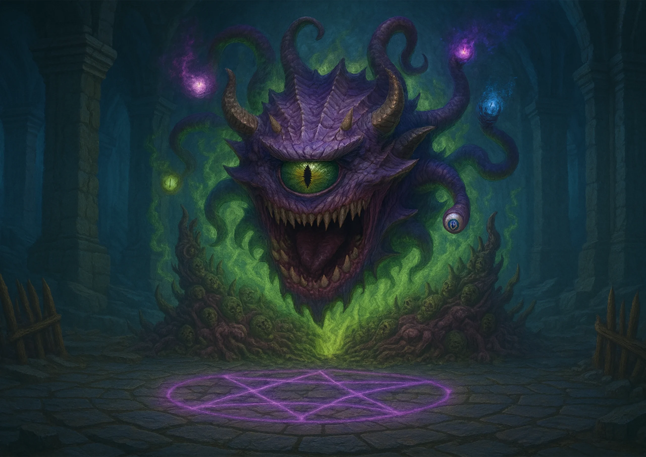 Gdy drużyna dotarła z powrotem do sali z ołtarzem, ich oczom ukazał się beholder, wynurzający się z portalu splecionego z ciał goblinów. Walka była zacięta. Niestety, jeden z promieni petryfikujących trafił Ambraxasa, znacznie osłabiając kompanię. Próby przywrócenia mu postaci zakończyły się niepowodzeniem.