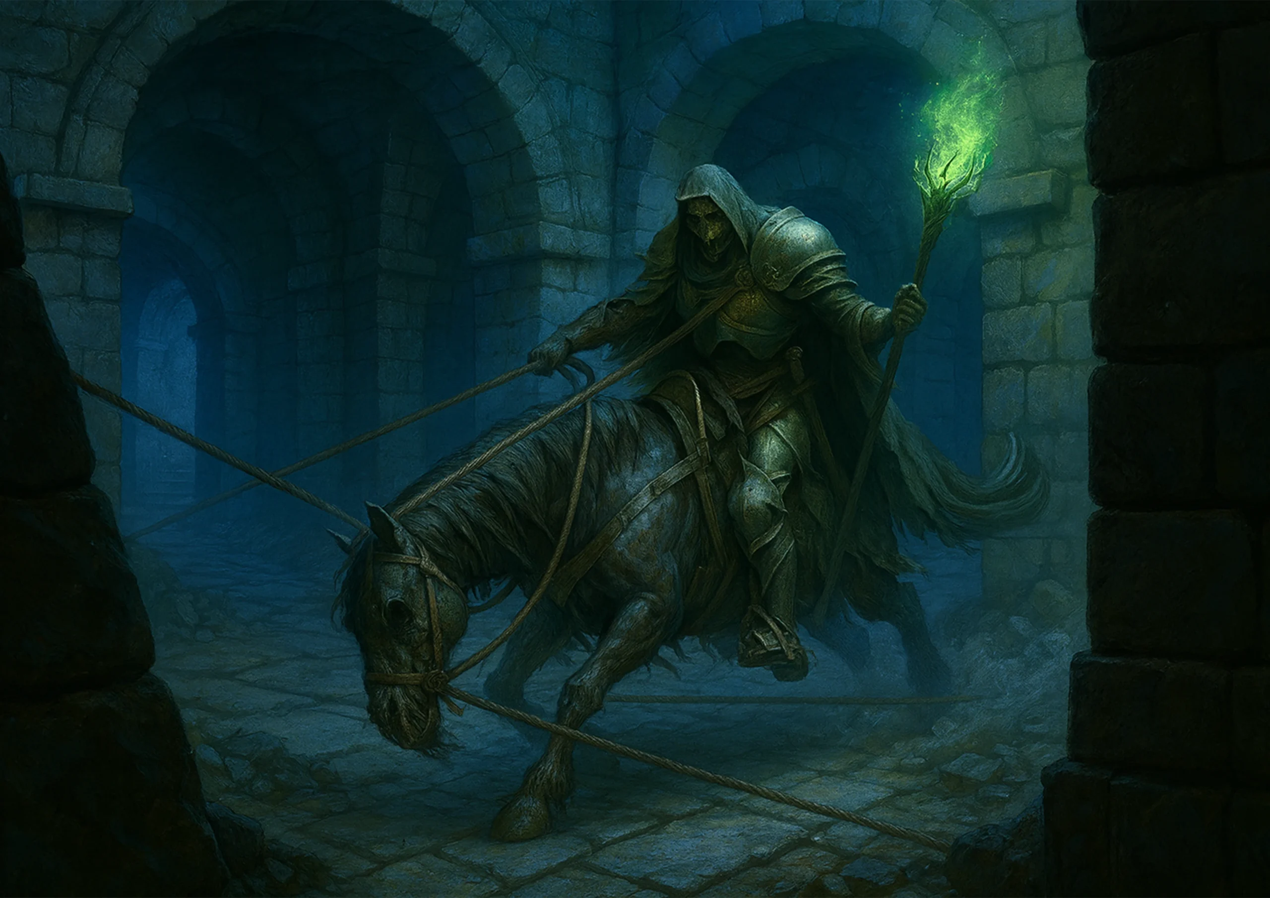 W kolejnych korytarzach natrafili na skrzyżowanie, z którego odchodziły cztery tunele. W każdym rogu znajdowało się pomieszczenie, do którego prowadziły dwa wejścia. W jednej z odnóg Ambraxas zauważył patrolującego nieumarłego – zastawili na niego pułapkę i powalili go liną. Gdy byli bliscy jego zniszczenia, przeciwnik zaczął przemieszczać się pomiędzy czterema komnatami, aktywując znajdujące się tam pentagramy i przyzywając do życia goblińskie zwłoki.
