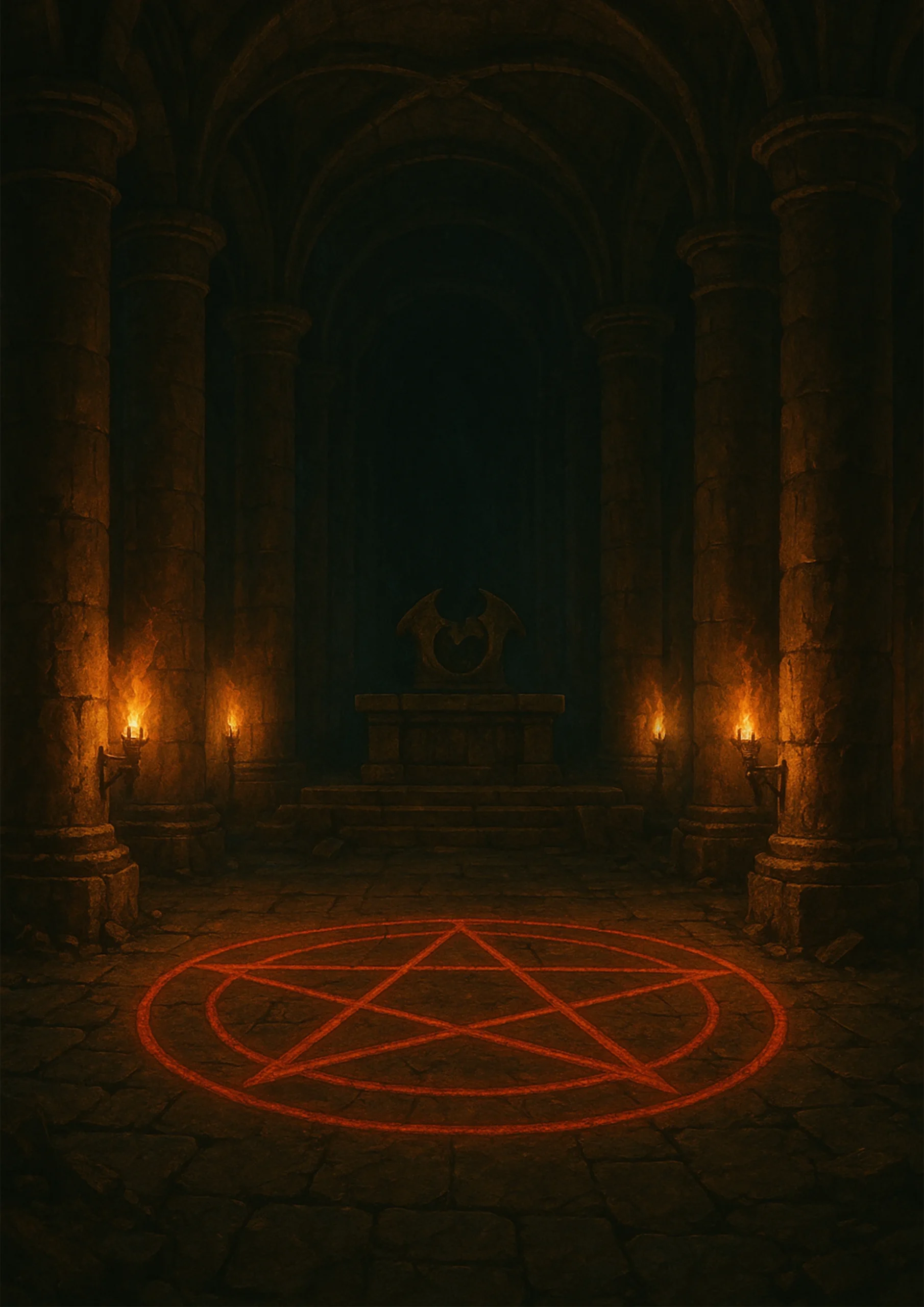 Podążając wąskim tunelem, dotarli do sali z ośmioma kolumnami. W jej centrum znajdował się pentagram, a na końcu – ołtarz na podwyższeniu. Ambraxas dostrzegł w nim wgłębienie przypominające zniszczony przez niego wcześniej amulet kleryka. Używając kościanego klucza, udało mu się otworzyć tajne przejście – podwyższenie osunęło się, odsłaniając dalszy tunel.