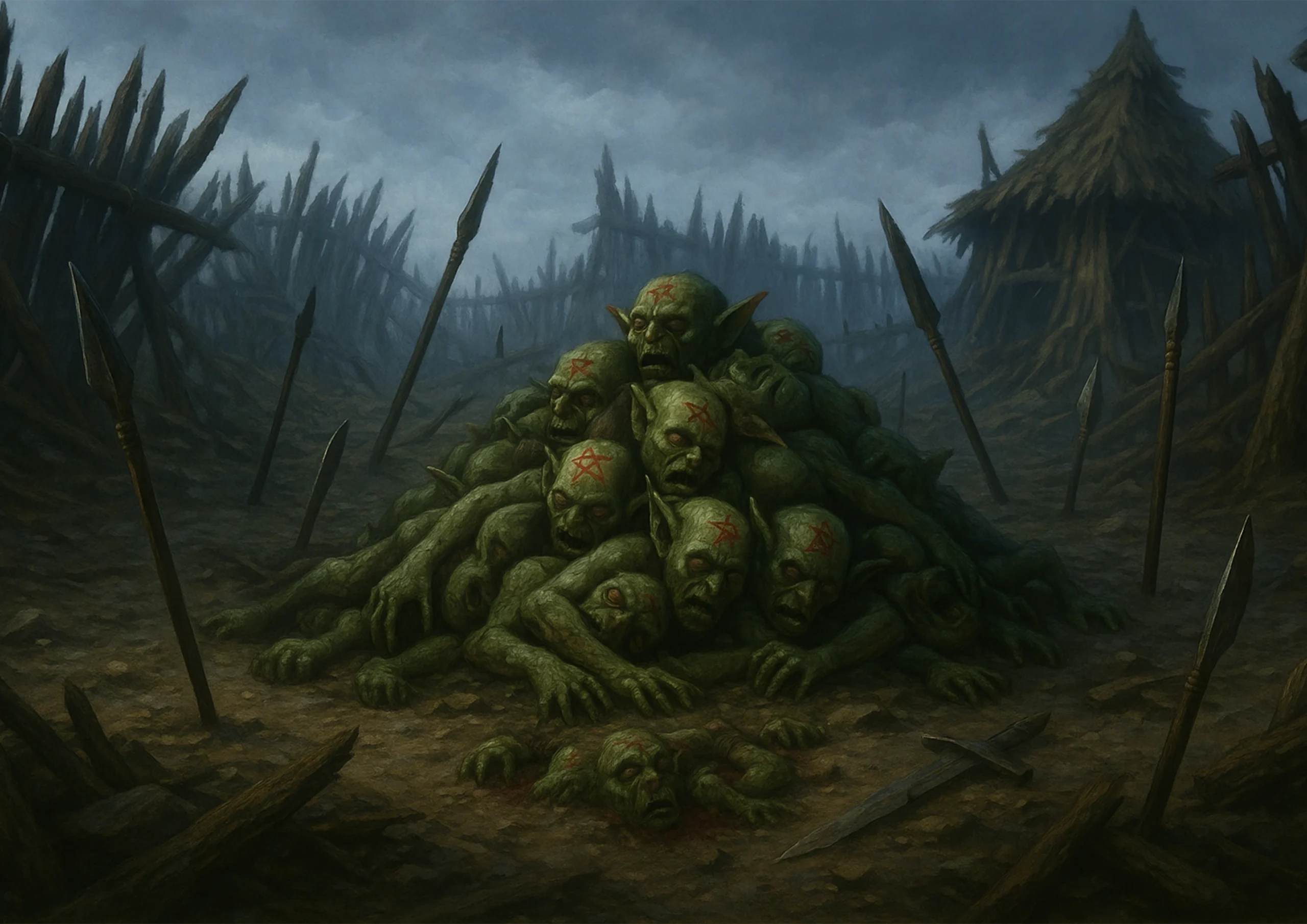Ostrożnie minęli zasieki i wkroczyli do wnętrza obozu. Ambraxas wyczuł złowrogą energię. Wkrótce ich oczom ukazał się stos goblińskich ciał, z pentagramami wyciętymi na czołach. Drakon odprawił rytuał poświęcenia nieczystego miejsca — tam, gdzie kapnęła woda święcona, ciała zaczęły się rozkładać jakby rozpuszczane przez kwas.