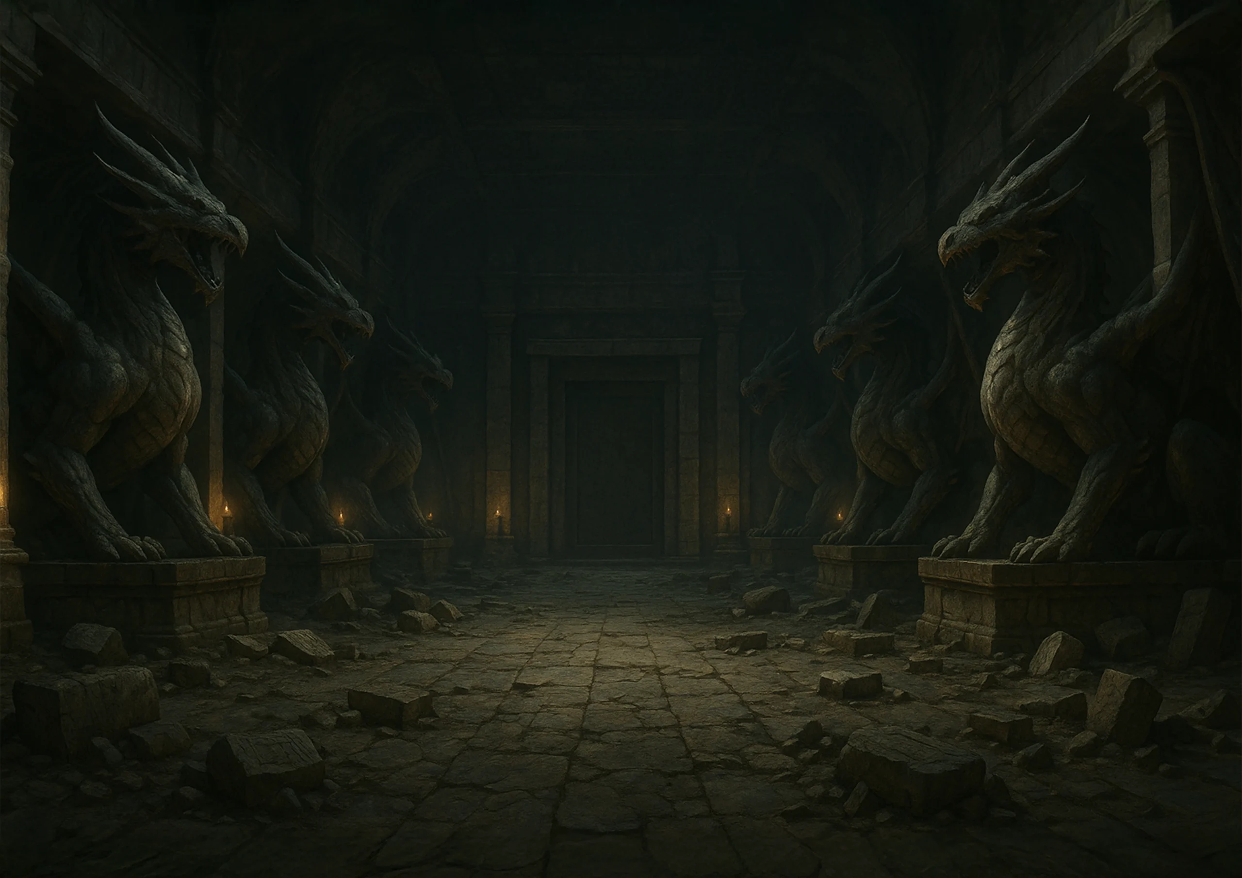Wzdłuż bocznych ścian stały masywne posągi sześciu smoków — po trzy z każdej strony. U ich stóp leżały smocze szkielety, wyglądały niczym otwarte grobowce.