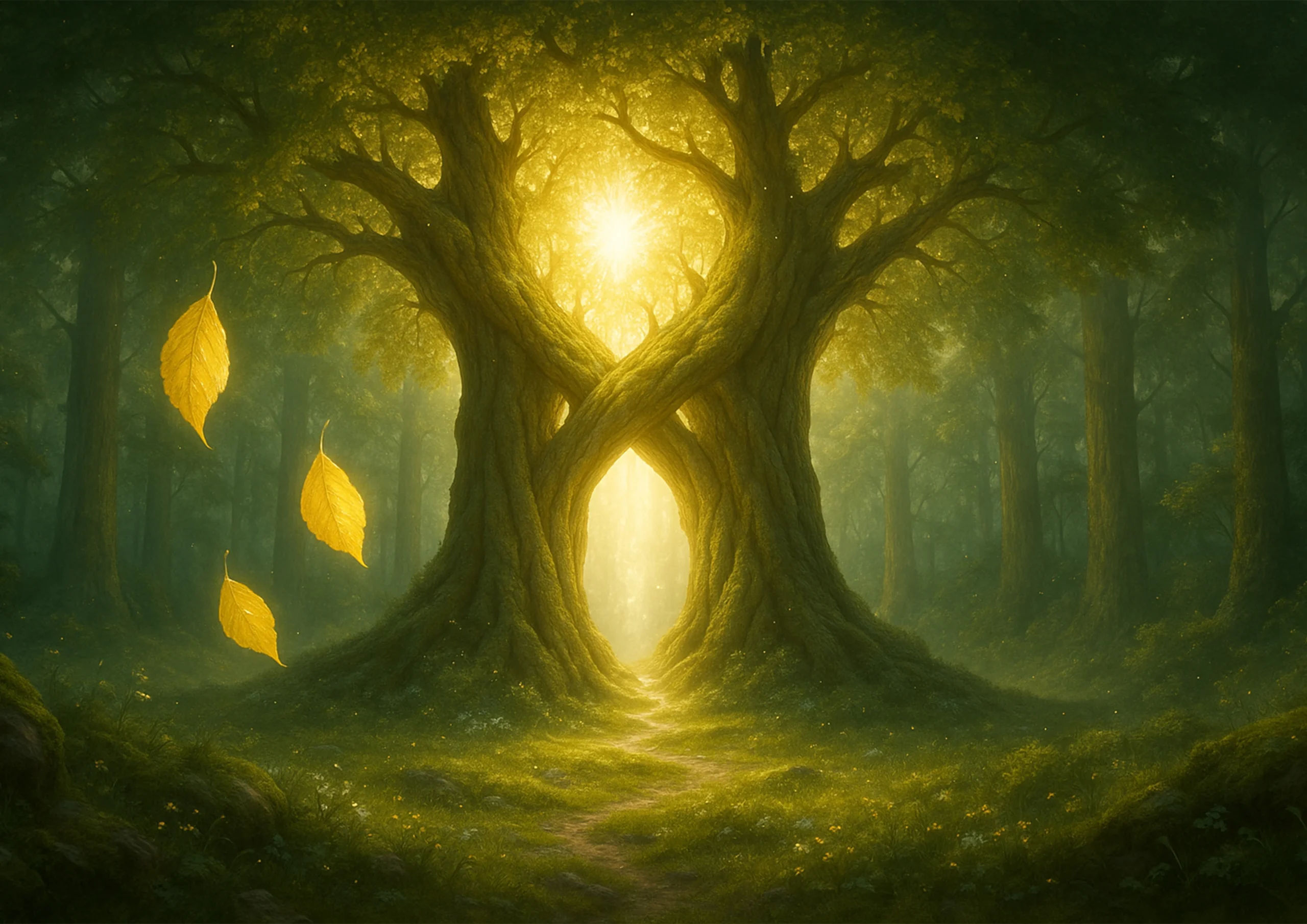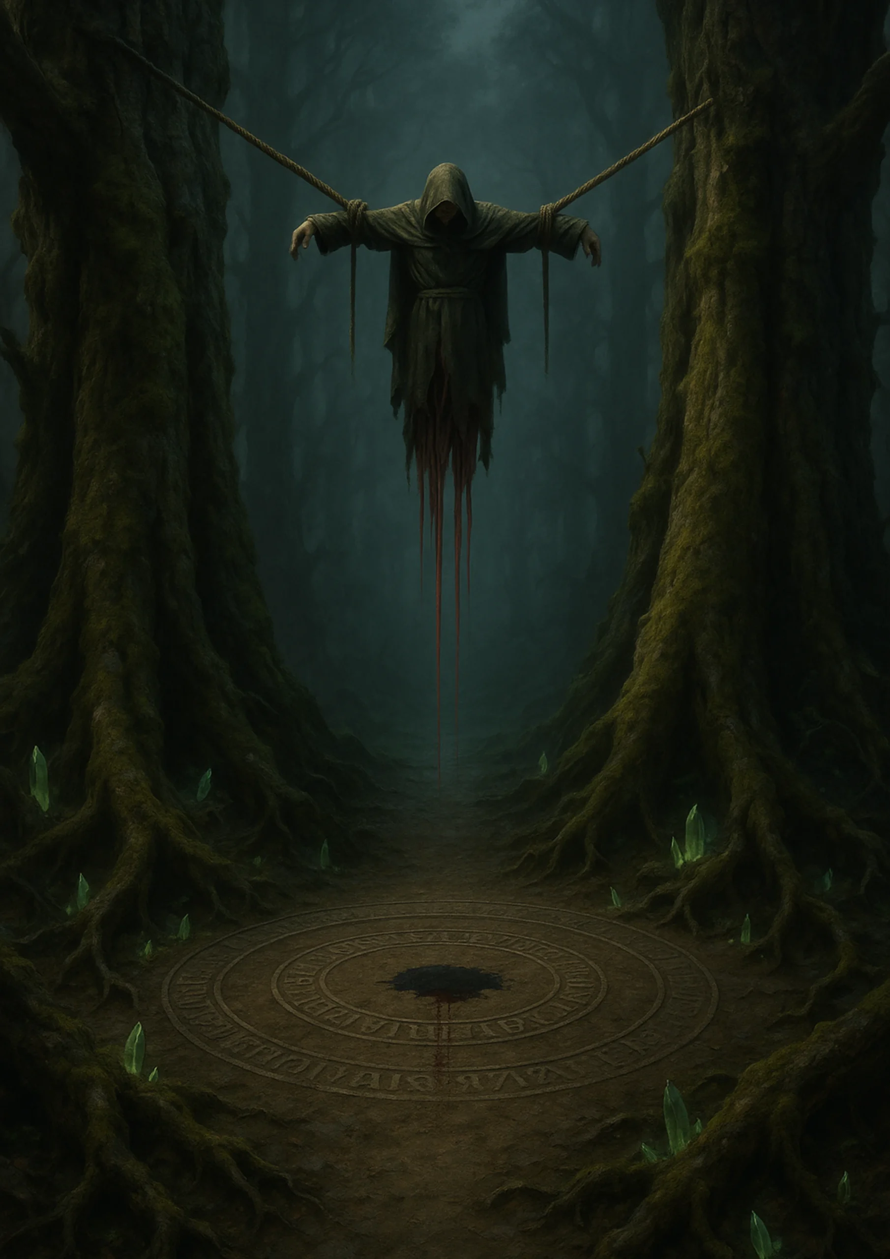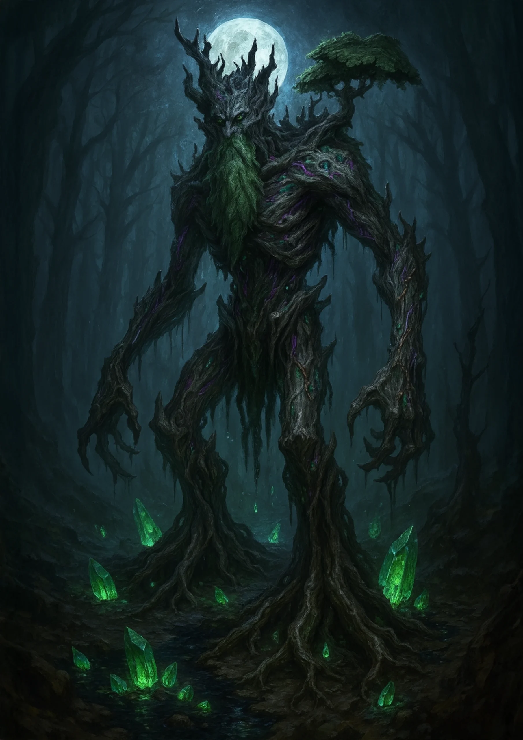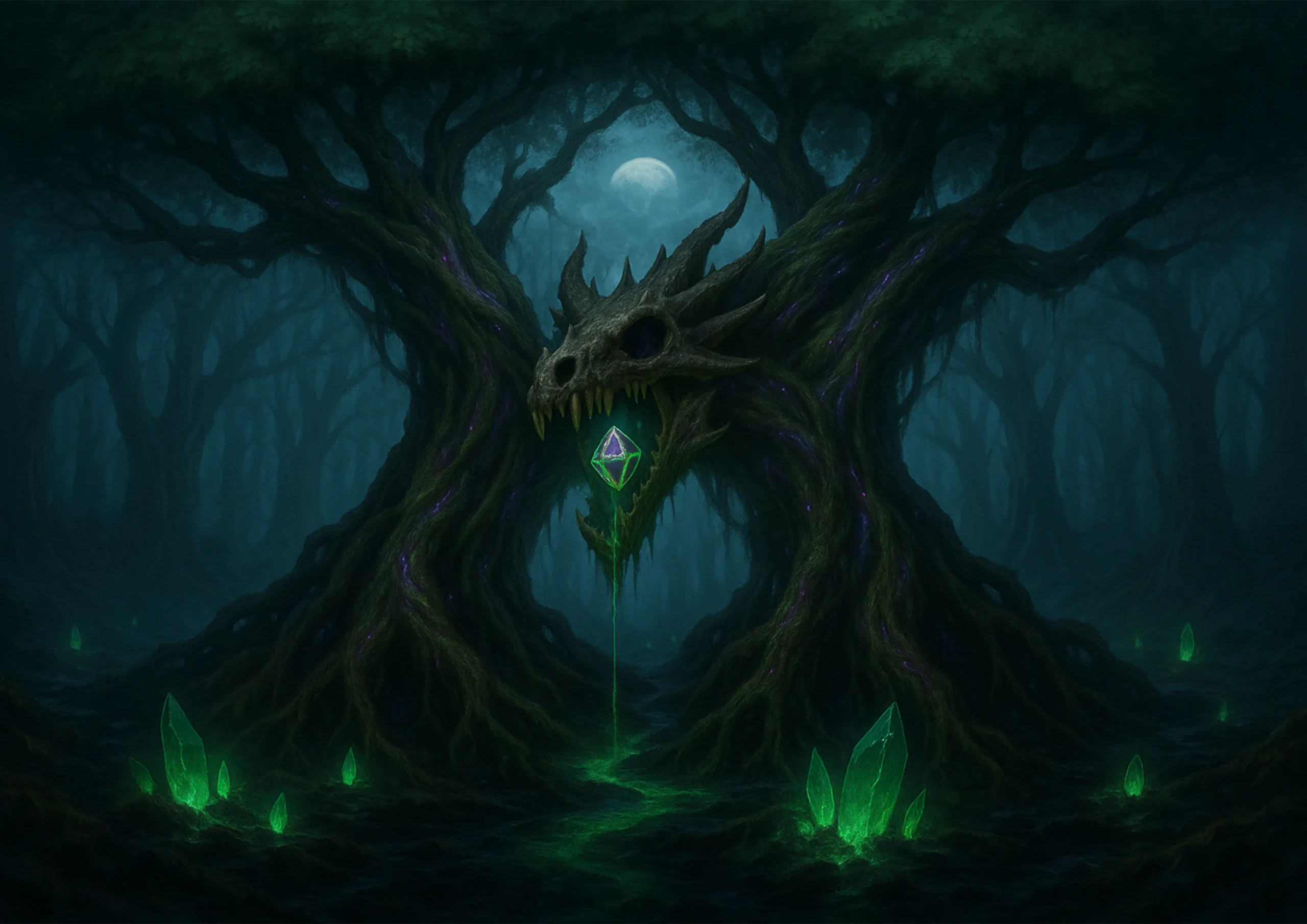 W tym samym czasie, gdy drużyna penetrowała podziemia kasztelu, Bao pogrążony był we śnie, który okazał się równie realny, co przerażający. Noc była gęsta i duszna, jakby cała puszcza oddychała jednym obcym rytmem, a każdy oddech niósł zapach wilgoci i ziemi zmieszanej z czymś niepokojącym, niemal toksycznym. Gdy szedł przez las, konary drzew uginały się ku ziemi niczym zmęczone ramiona starców, z ich pni wyrastały kryształy pulsujące zielonkawym światłem. Każdy krok tabaxi brzmiał jak uderzenie w dzwon, a echo niosło się w nieskończoność, odbijając się od liści, tworząc złowieszczą symfonię.