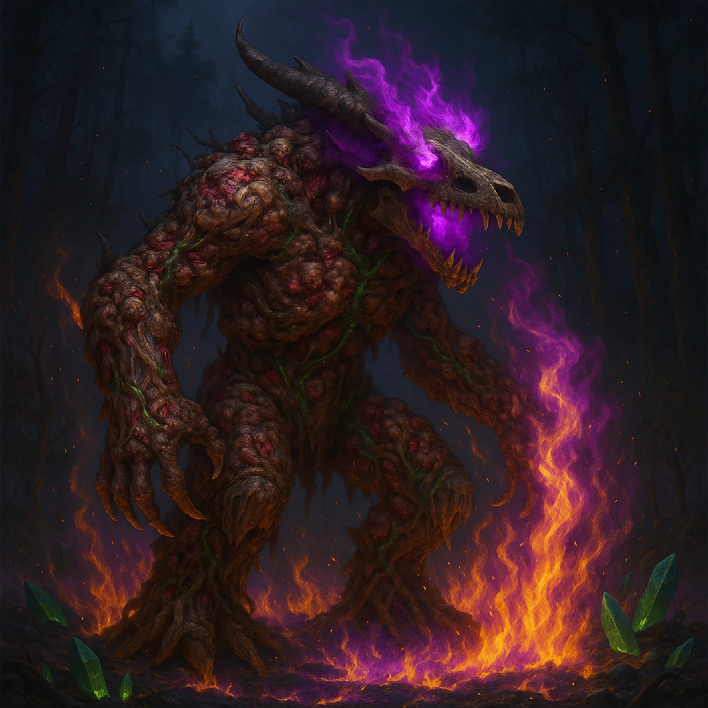 Abominacja, śmiejąc się w głosy, wzniosła się w powietrze i wleciała prosto w wypełnioną zieloną mazią, paszczę smoka. W momencie jego ciało i zwłoki kultystów połączyły pędy i konary spaczonych drzew, tworząc ogromny drewniany konstrukt. Gdy smocza czaszka z wystającym z niej ciałem abominacji pojawiła się w miejscu, gdzie powinna znajdować się głowa, z wnętrza konstruktu buchnął fioletowy ogień, podpalając go całego.