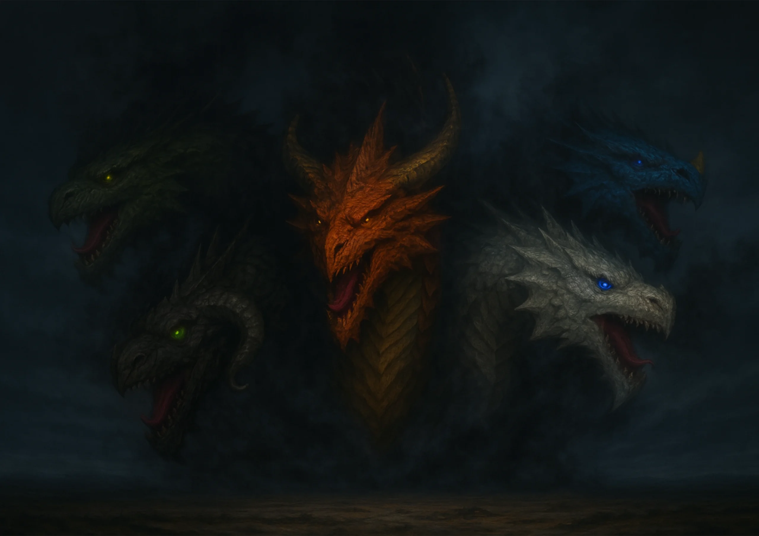 Lecz w tej samej chwili, gdy jego palce zacisnęły się na włóczni, świat przed jego oczami zawirował, a ciemność zaczęła wdzierać się w jego zmysły. Nagle niebo nad nim pociemniało, jakby wchłonęło światło. Przed nim ukazała się przerażająca sylwetka ogromnego smoka, potężna i majestatyczna, a jego pięć głów unosiło się nad Drakonem.