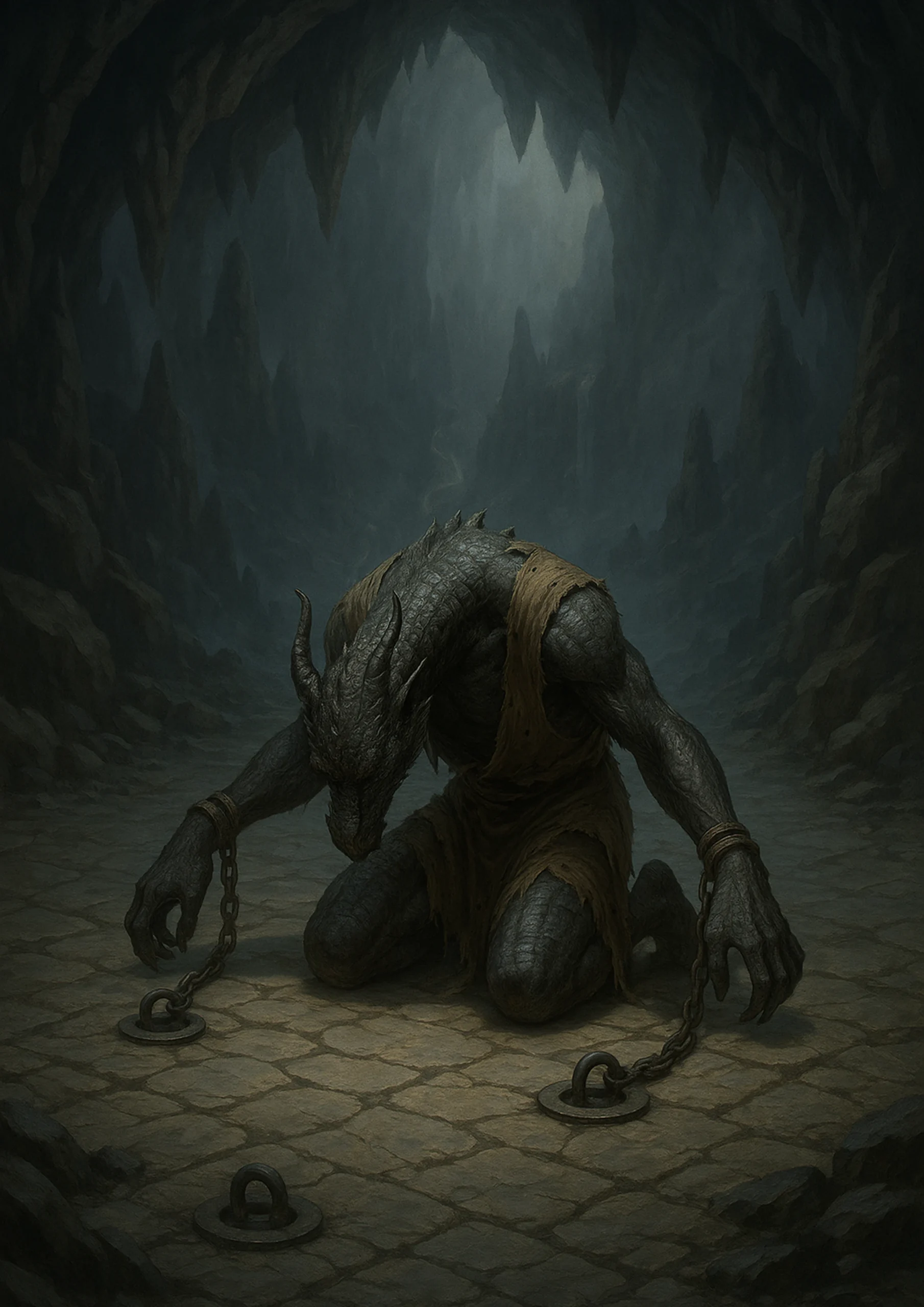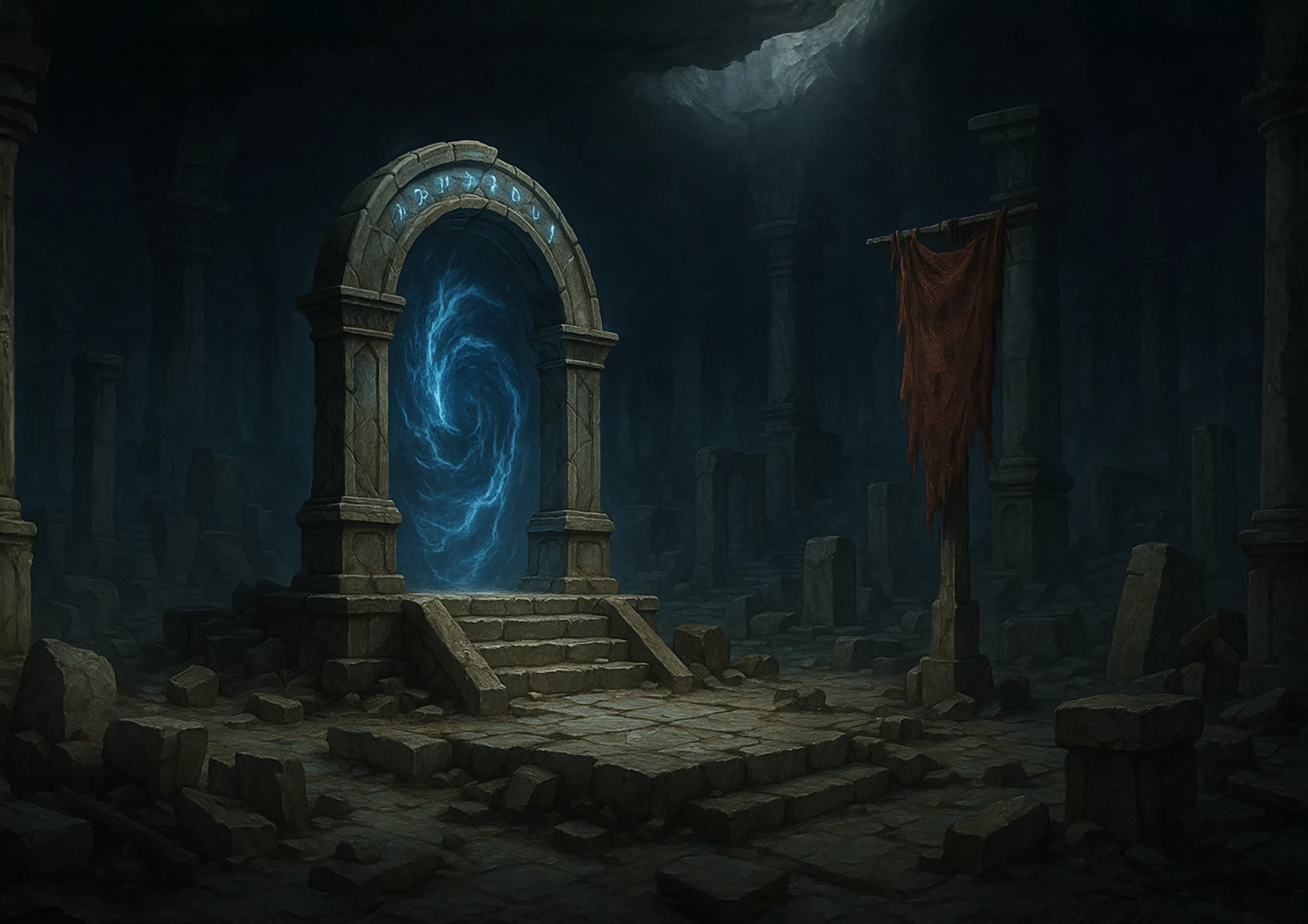 Wnętrze ruin emanowało dziwną, odległą energią. Ściany były pokryte inskrypcjami w języku, którego nie rozumiał, a w samym sercu groty spoczywał masywny, półzawalony portal – ozdobiony symbolem, którego blask przygasł przed wiekami. Nagle grzmot wstrząsnął powietrzem, a w następnej chwili wejście eksplodowało pod uderzeniem smoczego oddechu.