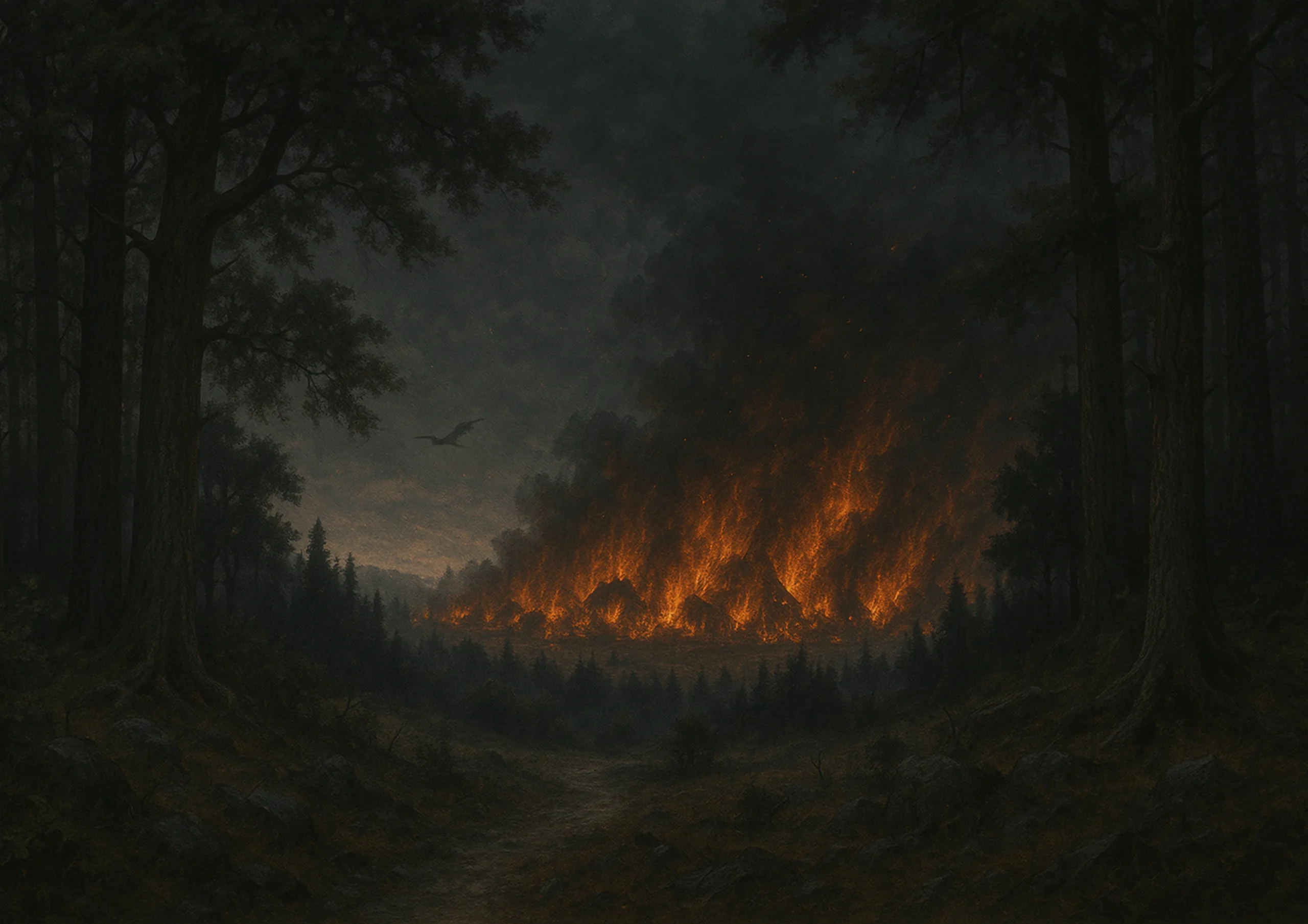 Zerwał się na nogi i wspiął na pobliskie wzgórze. Gdy spojrzał na horyzont, zamarł. Nad wioską unosiły się języki ognia, a czarne sylwetki krążyły nad dachami. W oddali słychać było ryk. Nie musiał widzieć więcej. Było już za późno.