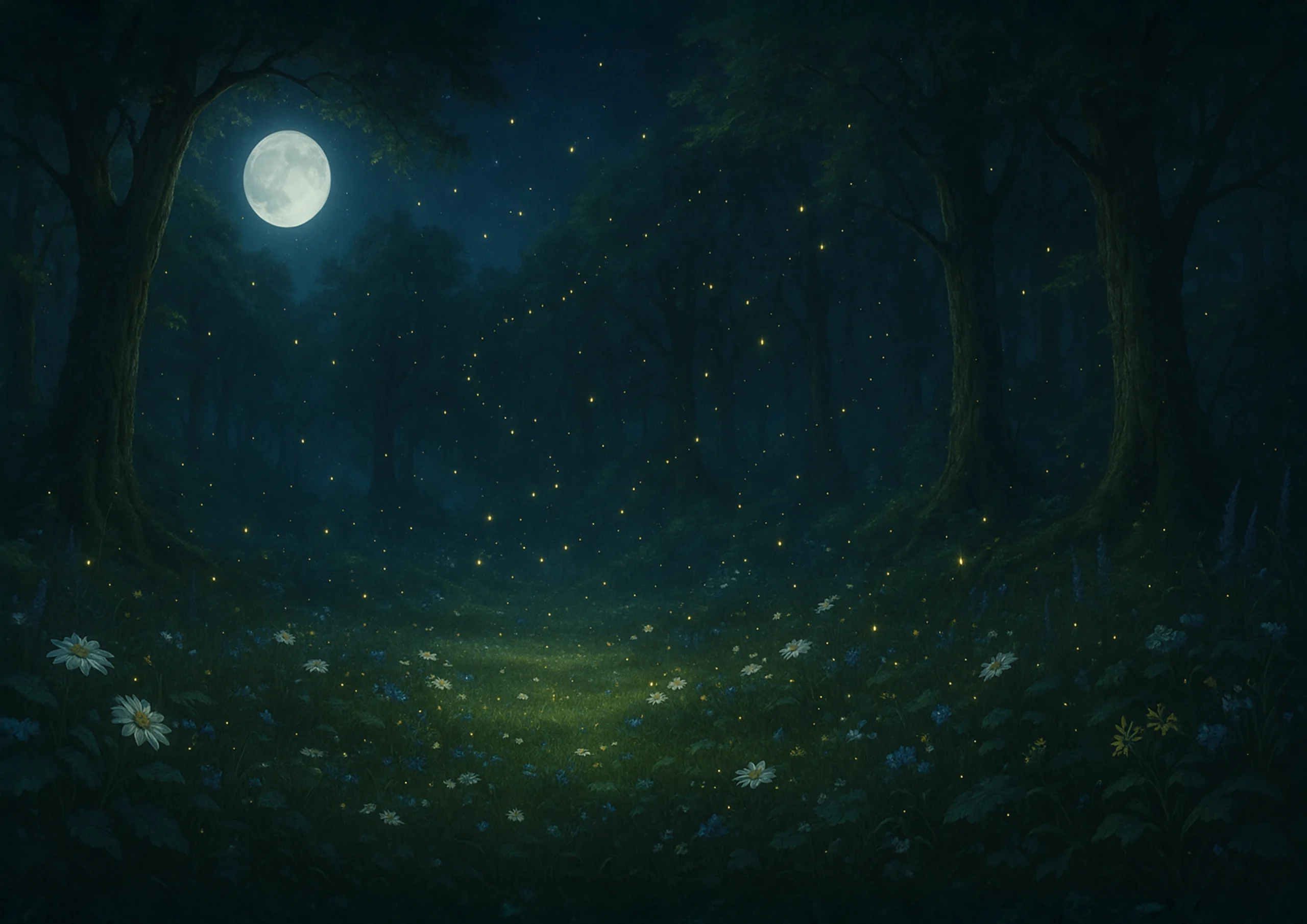 Od tamtej pory, gdziekolwiek się pojawiała, wokół niej krążyły świetliki, jak wierne towarzyszki. Tam, gdzie stawiała stopy, rozkwitały drobne kwiatki. A w ciemności jej oczy odbijały światło niczym kocie, połyskując tajemniczym blaskiem — darem krainy, która przyjęła ją jak swoją.