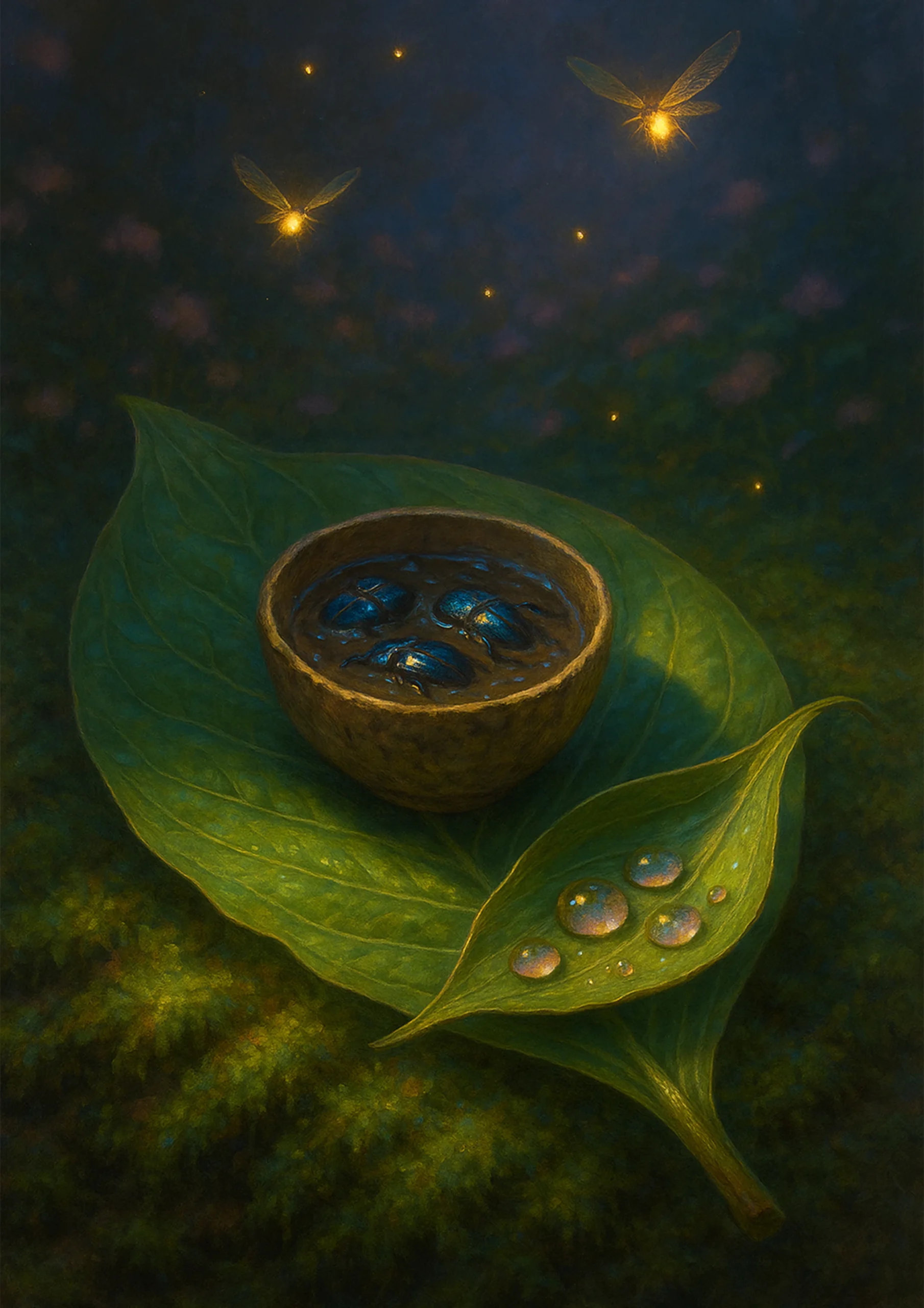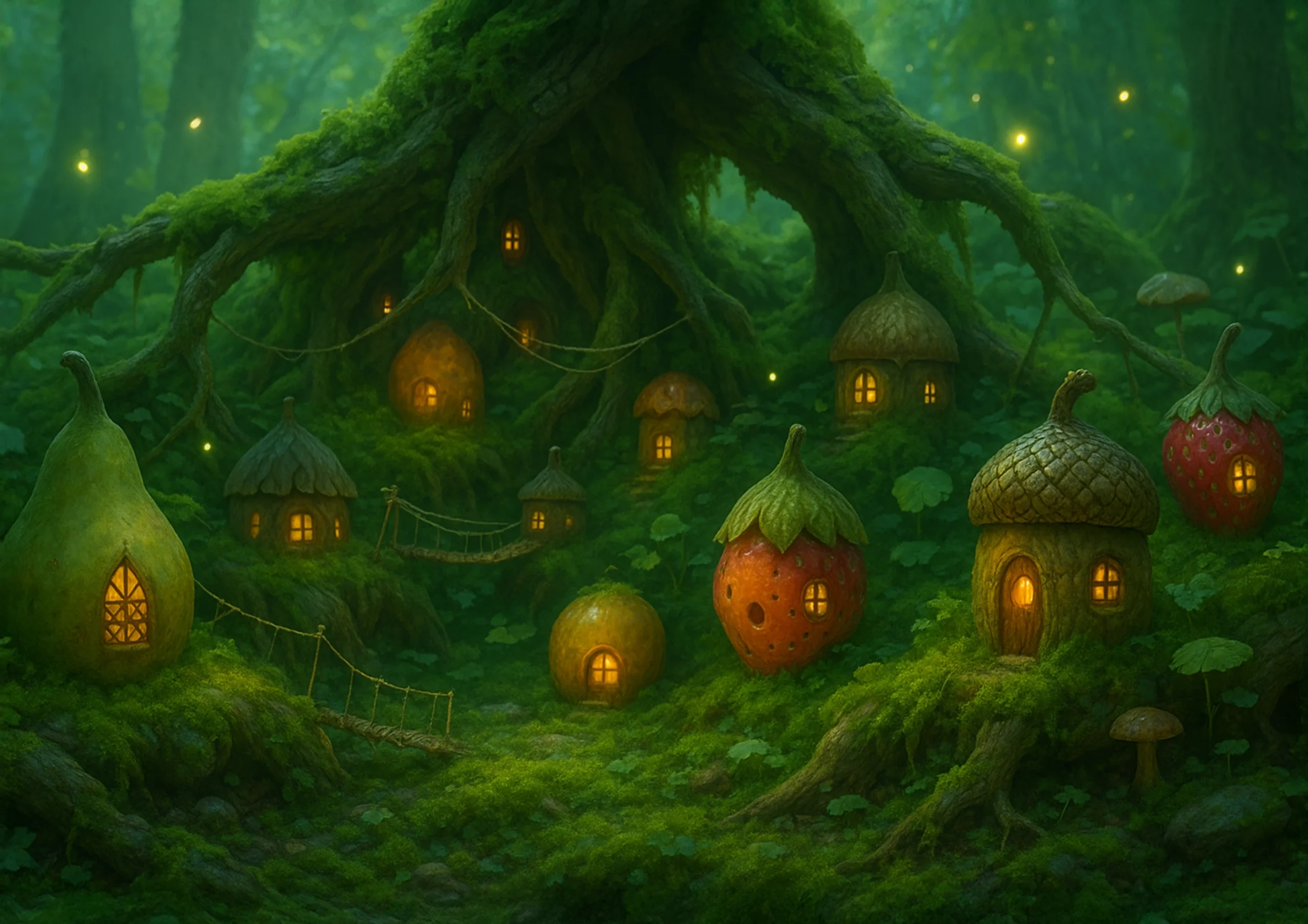 Hilda otworzyła oczy. Leżała na miękkim mchu, pod baldachimem drzew, których liście falowały leniwie w różowym świetle. Powietrze pachniało tysiącem nieznanych jej kwiatów, tak intensywnie, że aż zakręciło się jej w głowie. Wokół rozciągała się maleńka wioska — domki zbudowane z mchowych kopuł i pustych łupin orzechów, połączone delikatnymi pajęczynowymi mostkami. Wszędzie migotały świetliki, a maleńkie robaczki toczyły ożywioną rozmowę: